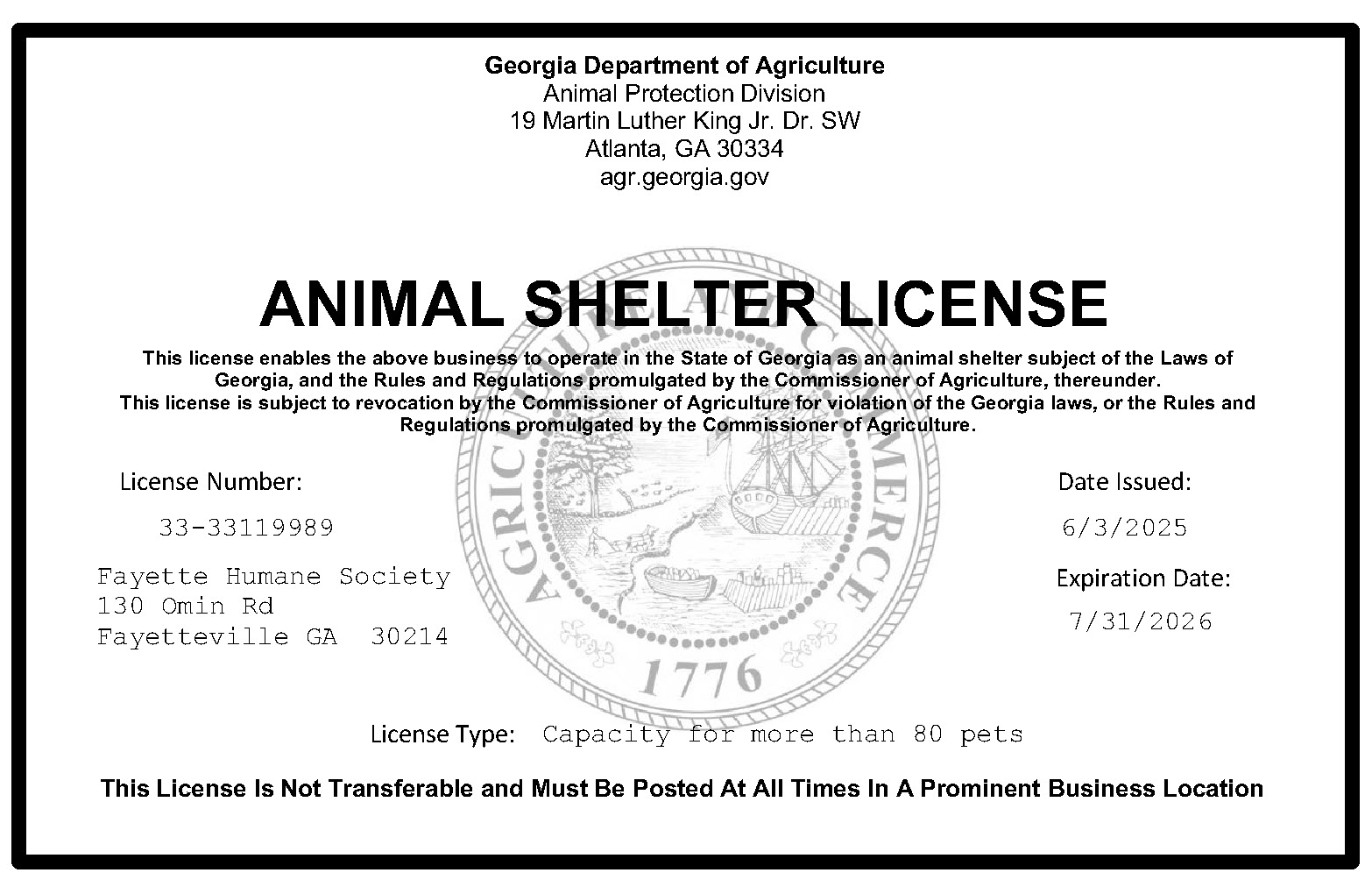 Incorporated in 1973, the Fayette Humane Society (FHS) is the oldest nonprofit humane organization in Fayette County, Georgia. The FHS, staffed entirely by volunteers, is a 501(c)(3) nonprofit organization and is supported entirely by individual and corporate donations. Because we do not have a shelter, all of the animals we rescue live in temporary foster homes until they are adopted. We believe that all companion pets have intrinsic value and should be treated with the reverence and care they deserve.